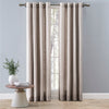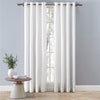 This textured single panel woven linen blend Swadlincote lined grommet brings a soothing casual quality to any room. The fabric is loosely woven with slub yarns, which creates a warm and natural effect. The rich lining behind the light filtering fabric adds fullness and creates privacy so that the woven fabric hangs over the quality lining gracefully and makes a perfect dressing for any window. This 52" wide panel features 8 metal grommets measuring 1.5" inside diameter. Brush nickel grommet finish for colors white and grey. Antique bronze grommet finish for colors Natural and Toffee. To hang, use a decorative rod with matching grommet finish with a diameter of up to 1.25". Available in both 63" and 84" length as well as patio width LINED - WOVEN TEXTURED LINEN-BLEND FABRIC: This loosely woven textured fabric is both casual and elegant, creating a warm look and feel in any space. The rich brushed fabric lining creates the perfect amount of light filtration maintaining some privacy, while allowing the curtain to hang gracefully and beautifully in any room